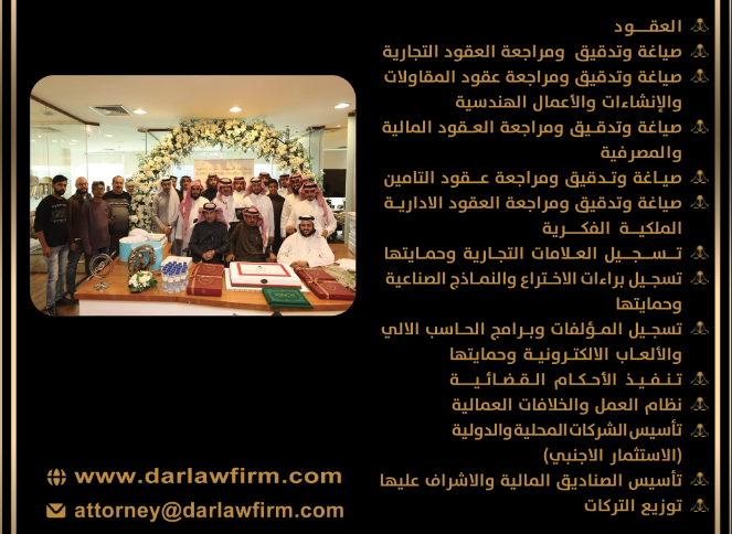كافة الخدمات القانونية، وبصفة خاصة الخدمات المتعلقة بقانون الشركالدار للمحاماةت والقانون التجاري، والقوانين المصرفية والمالية، والتحكيم المحلي والدولي، والقضايا المتعلقة بالمسائل التجارية والعقود الإدارية والمدنية والتجارية والعمالية والتأمين في منطقة .الشرق الأوسط ، تقدم من خلال فريق عمل المكتب المؤهلين وهم من ذوي خبرات مهنية في مجالات القوانين والأنظمة في المملكة العربية السعودية