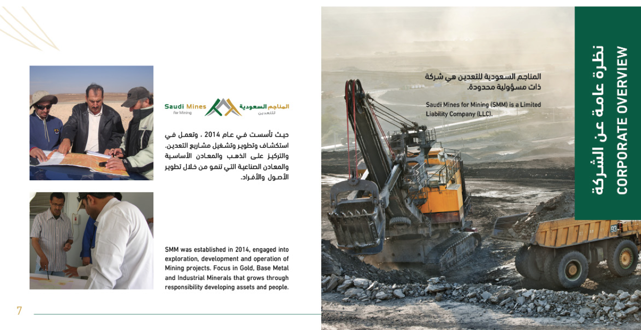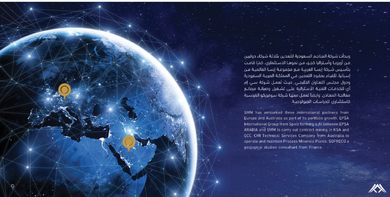شركة المناجم السعودية للتعدين المناجم السعودية للتعدين (SMM) هي شركة ذات مسؤولية محدودة (ذ.م.م). تأسست شركة SMM في عام 2014، وتعمل في مجال استكشاف وتطوير وتشغيل مشاريع التعدين. التركيز على الذهب والمعادن الأساسية والمعادن الصناعية التي تنمو من خلال المسؤولية عن تطوير الأصول والأفراد. شرعت SMM في التعاقد مع ثلاثة شركاء دوليين من أوروبا وأستراليا كجزء من نمو محفظتها. قامت مجموعة EPSA الدولية من إسبانيا بتأسيس شركة EPSA Arabia مع SMM لتنفيذ عقود التعدين في المملكة العربية السعودية ودول مجلس التعاون الخليجي. شركة CMI للخدمات الفنية من أستراليا لتشغيل وصيانة مصانع معالجة المعادن. سوفريكو هو مستشار الدراسات الجيولوجية من فرنسا.